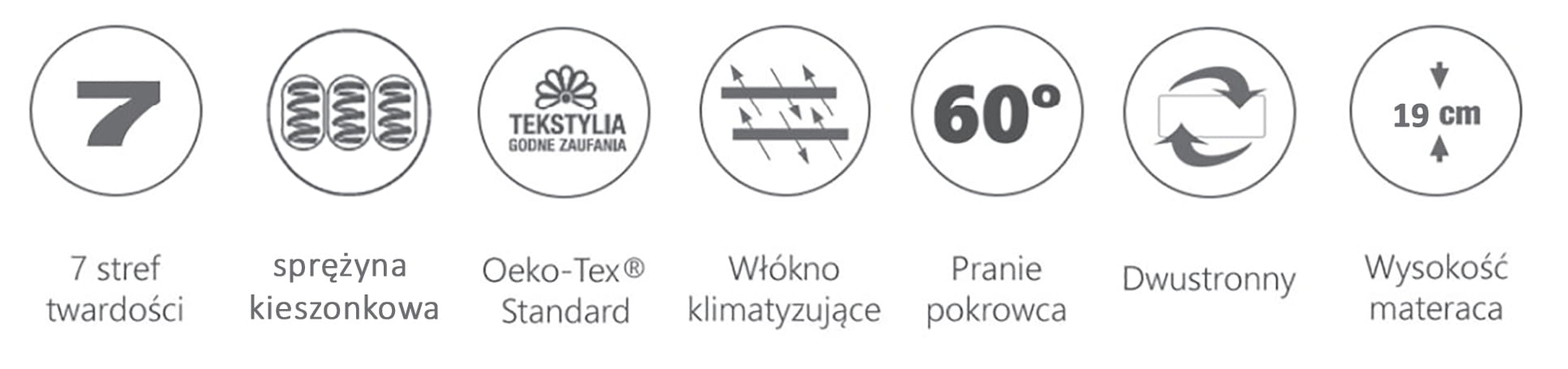 7 stref twardości– materac został podzielony na 7 stref o różnej twardości. Strefy te pozwolą uformować prostą linię kręgosłupa. Im wyższa jest waga ciała, tym bardziej można docenić komfort materaca z siedmioma strefami